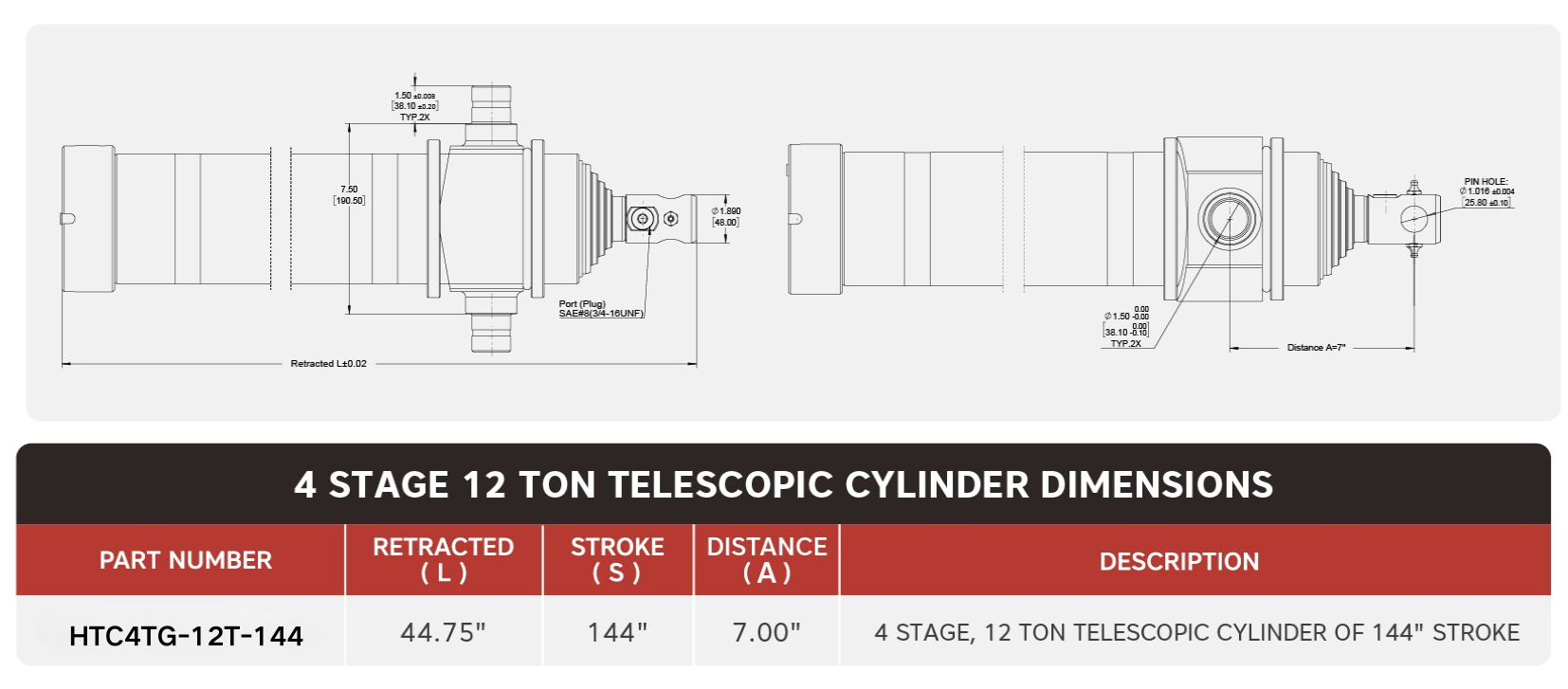 "HTC4TG-12T-144"، 4 اسٹیج، 144 کا 12 ٹن" اسٹروک ٹیلیسکوپک سلنڈر