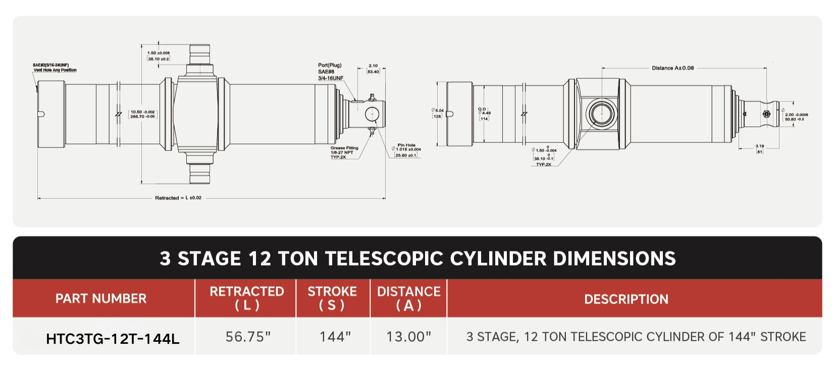 "HTC3TG-12T-144L"، 3 اسٹیج، 144 کا 12 ٹن" اسٹروک 13"ٹرونین ڈسٹینس ٹیلیسکوپک سلنڈر